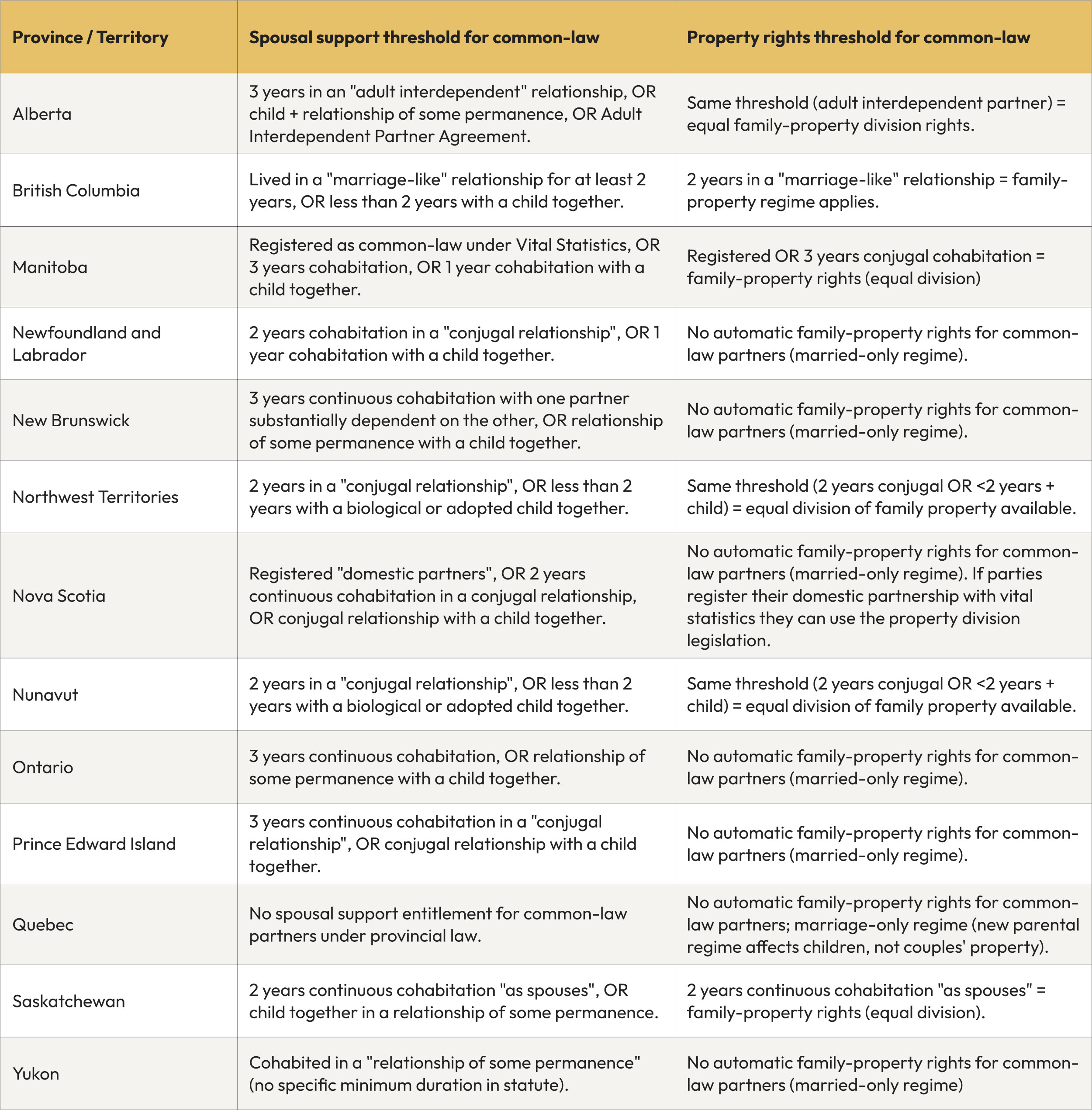 Property rights and spousal support are governed by provincial regulations. The provincial thresholds for common law partnership and for spousal support differ significantly from the federal definition and from each other.